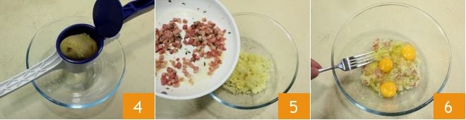 Une fois la pomme de terre cuite, écrasez-la encore chaude avec un presse-purée 4 (ou laissez-la tiédir légèrement, épluchez-la puis écrasez-la avec les dents d'une fourchette) et recueillez-en la pulpe dans un petit bol ; ajoutez les dés de bacon rissolés 5 et les œufs 6. Mélangez les ingrédients avec une fourchette,