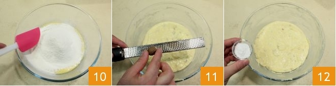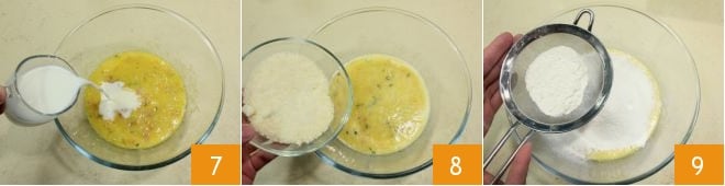 puis ajoutez le lait 7 et le Grana Padano râpé 8, ensuite tamisez la farine dans le bol 9