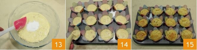 Mélangez encore le tout avec la spatule 13 et transférez la préparation obtenue dans une poche à douille. Tapissez un moule à muffins avec des caissettes colorées et remplissez-les avec la pâte jusqu'au bord 14 (de manière à ce qu'ils prennent la forme typique de champignon à la cuisson). Faites-les cuire dans un four statique préchauffé à 180° pendant environ 20 minutes (160° pendant environ 15 minutes si four ventilé). Une fois cuits, sortez les muffins de pommes de terre du four 15 et laissez-les tiédir avant de les servir !