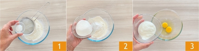 Pour réaliser les muffins sans beurre, commencez par tamiser la farine et la levure 1, ajoutez le sucre en poudre 2, mélangez avec une spatule et mettez de côté. Dans un bol, cassez les œufs entiers et ajoutez le yaourt 3.