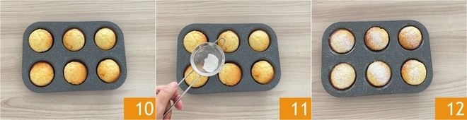 Sortez les muffins sans beurre du four 10, laissez-les refroidir puis saupoudrez-les de sucre glace 11 avant de les servir 12.