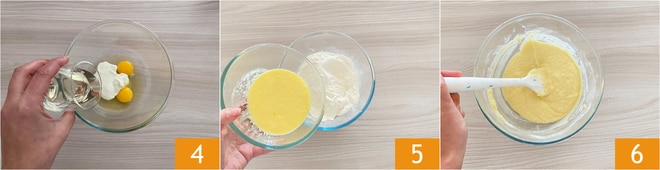 Ajoutez également l'huile 4 et mélangez pour amalgamer, puis versez le mélange de yaourt et d'œuf dans la farine 5. Continuez à mélanger avec une spatule jusqu'à obtenir un mélange crémeux et sans grumeaux 6.