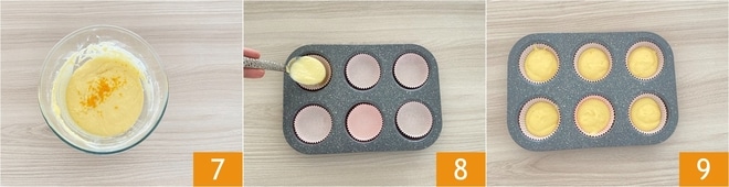 Aromatisez avec le zeste d'orange râpé et mélangez une dernière fois. Remplissez un moule pour 12 muffins avec les caissettes en papier de 4 cm. Mettez environ deux cuillères d'appareil dans les caissettes en papier pour la cuisson des muffins 8, en laissant au moins 1 cm du bord 9, chaque muffin cru doit peser environ 40 g. Faites cuire les muffins dans un four préchauffé, en mode statique à 180° pendant environ 18 minutes.