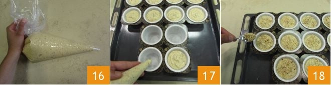 Transférez la pâte obtenue dans une poche à douille 16 et utilisez-la pour remplir 12 caissettes 17. Décorez avec le praliné de noisettes 18,