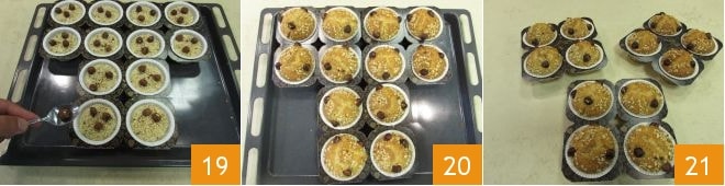 et avec les noisettes entières. Enfournez les muffins dans un four statique préchauffé à 180° pendant 35 minutes au milieu du four. Puis sortez-les 20, laissez tiédir et servez vos muffins aux noisettes 21 !