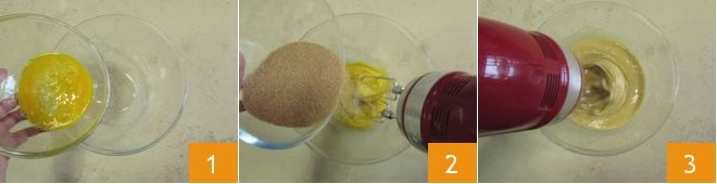 Pour préparer les muffins aux noisettes, commencez par verser les œufs dans un bol 1. Commencez à les battre avec un batteur électrique et ajoutez ensuite le sucre de canne 2. Continuez à battre jusqu'à ce qu'ils soient gonflés et mousseux 3.
