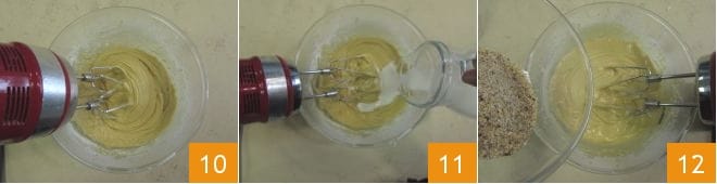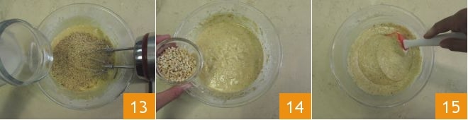 Quand ils seront complètement absorbés 10, versez une partie du lait 11, mélangez et ajoutez la farine de noisette 12.