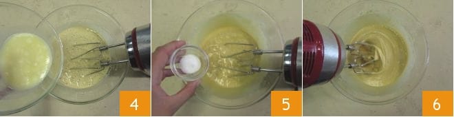 Versez ensuite le beurre fondu 4, le sel 5 et mélangez encore avec les fouets 6.