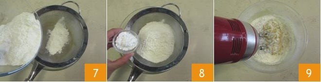 Tamisez ensuite directement dans le bol la farine 00 7 et la levure chimique 8. Incorporez-les au reste des ingrédients toujours en utilisant les fouets électriques 9.