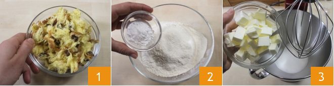 Pour préparer les muffins de panettone, commencez par déchiqueter le panettone en petits morceaux et réservez-le 1. Dans un bol, tamisez la farine avec la levure, le bicarbonate et le sel 2. Travaillez avec un robot culinaire ou un batteur électrique le beurre avec le sucre jusqu'à obtenir une crème 3.