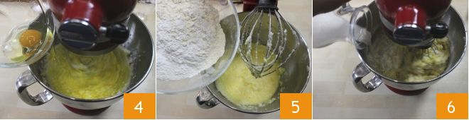Ajoutez les œufs un à un 4, les ingrédients secs 5, et enfin le lait en filet 6, tout en continuant à battre.