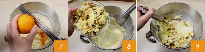 Une fois que les ingrédients sont bien amalgamés, ajoutez le zeste râpé d'une orange non traitée 7 et le panettone déchiqueté précédemment 8, puis incorporez-le au mélange à l'aide d'une spatule 9.