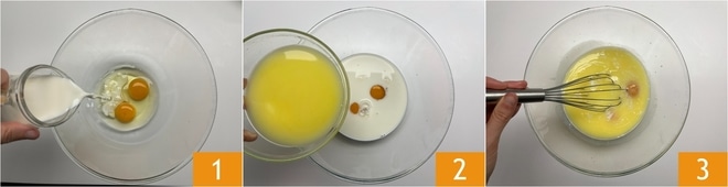 Pour préparer les muffins œil de bœuf effrayants, commencez par faire fondre le beurre et laissez-le tiédir. À ce stade, dans un bol, versez les œufs, le lait 1 et le beurre maintenant tiède 2. Mélangez bien avec un fouet 3.
