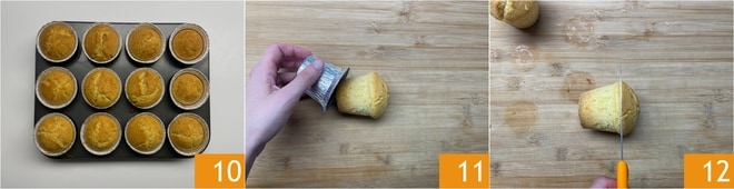 Après ce temps, vérifiez la cuisson avec un cure-dent et sortez les muffins du four 10, puis laissez-les refroidir. Retirez les muffins des moules 11 et découpez le dessus avec un petit couteau dentelé 12.