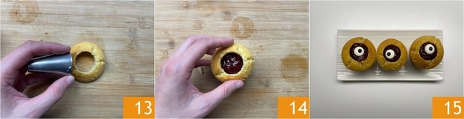 Faites un trou au centre du dessus avec un emporte-pièce de 2,5 cm; alternativement, vous pouvez utiliser la douille d'une poche à douille 13. Étalez la confiture sur la base du muffin et repositionnez le dessus découpé par-dessus 14. Placez au centre du trou, là où se trouve maintenant la confiture, un petit œil en sucre 15. Vos muffins œil de bœuf effrayants sont prêts à être servis!