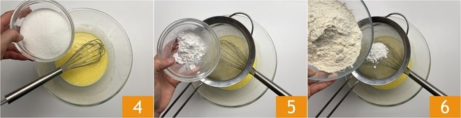Quand le mélange est homogène, ajoutez le sucre 4 et mélangez à nouveau. Tamisez la levure chimique à l'intérieur 5, puis la farine également 6.