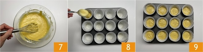 Mélangez bien jusqu'à obtenir un mélange épais et sans grumeaux 7. À ce stade, beurrez et farinez 12 moules en aluminium pour muffins, placez-les sur une plaque de cuisson et répartissez la pâte à l'intérieur à l'aide d'une cuillère 8. Cuisez dans un four statique préchauffé à 180°C pendant 40 minutes 9.