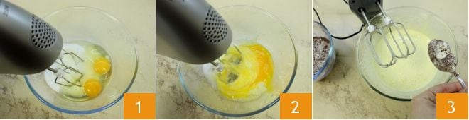 Pour préparer le gâteau en tasse (Mug cake), commencez par battre les œufs avec le sucre à l'aide d'un fouet électrique (1-2) ou d'un fouet à main : vous devez obtenir un mélange blanc et mousseux. Dans un bol, tamisez et mélangez la farine, le chocolat amer en poudre et la levure. Ajoutez les poudres petit à petit au mélange d'œufs et de sucre 3 en alternant avec le lait.