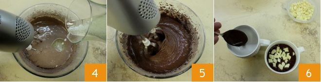 Une fois les ingrédients terminés, continuez à travailler avec les fouets et ajoutez également l'huile en filet 4 ; travaillez encore le mélange 5 jusqu'à obtenir une pâte fluide et homogène. Ensuite, transférez-la dans les mugs 6 en laissant environ 1 cm du bord (pour éviter que la pâte ne déborde lors de la cuisson).