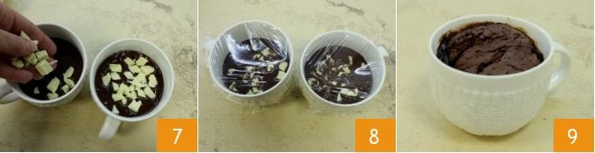 Ajoutez le chocolat blanc en morceaux 7, puis couvrez les mugs de film plastique adapté à la cuisson au micro-ondes 8 (le film sert à éviter que le petit gâteau ne gonfle trop pendant la cuisson ; vous pouvez l'omettre et verser moins de mélange dans la tasse, en ajustant avec une pour la bonne dose à utiliser). Ensuite, faites-les cuire au micro-ondes à 600 watts (ou à la puissance maximale de votre micro-ondes) pendant environ 1 à 2 minutes, vous devez vous ajuster en fonction de votre micro-ondes, indispensable pour cette préparation. Si vous préférez une consistance plus proche d'un gâteau, vous pouvez laisser le gâteau en tasse au micro-ondes quelques secondes de plus ; si vous le préférez comme un soufflé, le temps indiqué suffira. Lorsque le gâteau en tasse (mug cake) est prêt, sortez-le 9 et laissez refroidir.