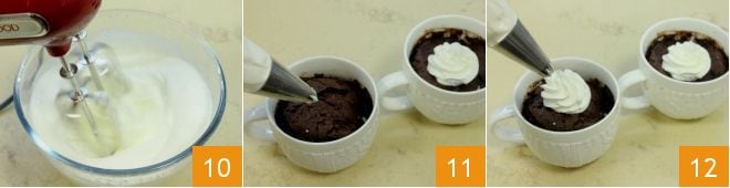 Entre-temps, montez la crème avec des fouets et un bol bien froids 10, transférez-la dans une poche à douille avec une douille en étoile. Une fois les mug cakes bien refroidis, décorez-les de petites touffes de crème fouettée (11-12). Servez le gâteau en tasse (Mug cake) comme dessert ou goûter gourmand !