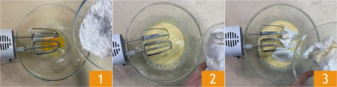 Pour préparer la naked cake avec panettone, commencez par la crème : dans un bol, mettez les œufs et le sucre glace 1, puis mélangez les ingrédients avec les fouets électriques. Ajoutez ensuite la ricotta 2 et le mascarpone 3.