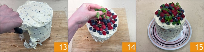Enfin, recouvrez l'extérieur avec la crème restante 13 et garnissez la surface avec des myrtilles, des framboises et quelques feuilles de menthe 14. Votre naked cake avec panettone est prête à être servie 15 !