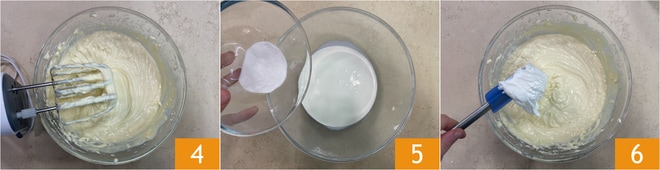 Continuez à travailler jusqu'à obtenir une crème mousseuse et homogène 4. Dans un autre bol, versez la crème, ajoutez le stabilisant 5 et montez. Incorporez la crème montée au mélange de ricotta et de mascarpone 6 en mélangeant de bas en haut pour ne pas les faire tomber.