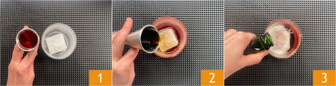Pour préparer le Negroni à la mode, commencez par placer un cube de glace dans un tumbler bas. Versez le bitter rouge 1, le vermouth rouge 2 et une partie de prosecco 3.