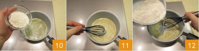 et lorsqu'il est fondu, ajoutez la farine 10 et mélangez avec un fouet en cuisinant pendant quelques minutes, vous obtiendrez ainsi la base épaississante appelée roux 11. Détendez avec le lait chaud tout en mélangeant 12