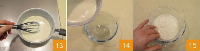 et poursuivez la cuisson en travaillant continuellement avec le fouet, jusqu'à ce que la sauce atteigne l'ébullition 13. Transférez le tout dans un bol 14 et couvrez avec un film plastique au contact et laissez refroidir à température ambiante 15.