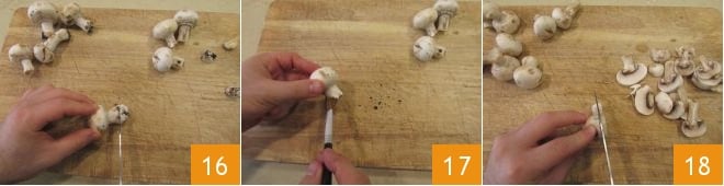 Passez à la farce : commencez par nettoyer les champignons de Paris. Tout d'abord, retirez la base 16, puis avec un petit pinceau, grattez toute la terre présente 17 et enfin, coupez-les finement 18. Rappelez-vous qu'il est conseillé de ne pas laver les champignons, pour ne pas leur faire absorber trop d'eau et ainsi perdre en saveur et en consistance. Seulement s'ils sont particulièrement sales, vous pouvez les rincer rapidement sous l'eau fraîche ou les nettoyer avec un chiffon humide.
