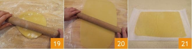 Reprenez la pâte et étalez-la avec un rouleau à pâtisserie sur une planche légèrement farinée 19, vous devez obtenir un rectangle de 50x30 d'une épaisseur d'environ 1-2 mm 20, éventuellement vous pouvez égaliser les bords en les coupant avec une lame. Transférez la pâte sur une feuille de papier sulfurisé 21;