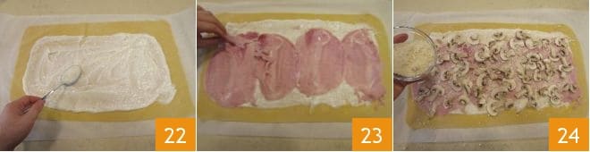 Répartissez ensuite 2-3 cuillerées à soupe de béchamel en l'étalant soigneusement sur toute la surface et en laissant quelques centimètres des bords 22. Puis commencez à farcir, disposez les tranches de jambon 23, les champignons et saupoudrez-les de Parmesan râpé (en gardant un peu de côté) avec une pincée de sel 24.