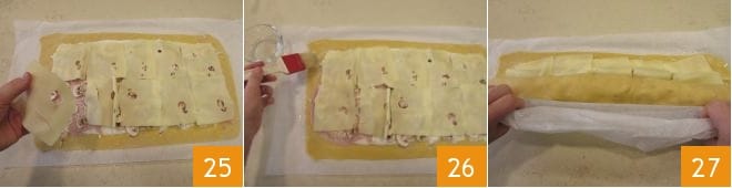 Pour finir, disposez l'Emmental en tranches 25. Humidifiez les bords avec très peu d'eau, pour qu'ils deviennent adhésifs 26 et enfin, roulez la pâte en vous aidant avec le papier sulfurisé 27.
