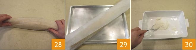 Enveloppez le rouleau dans le papier 28 et placez-le sur un plateau en le mettant au congélateur pendant environ 20 minutes 29. Cette étape est indispensable pour qu'il conserve parfaitement sa forme lors de la coupe. Entre-temps, versez quelques autres cuillerées de béchamel dans un plat de 30x20 et répartissez-la soigneusement sur toute la surface 30.