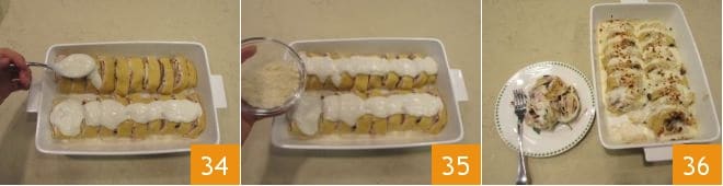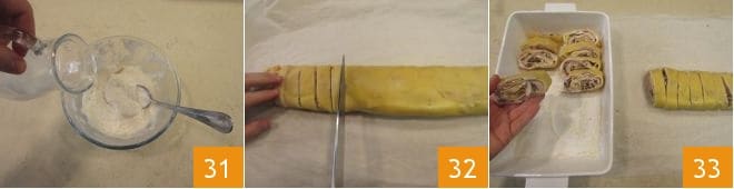 Ensuite, détendez la béchamel avec les 50 grammes de lait restants, pour la rendre beaucoup plus souple et mettez-la de côté : elle servira pour assaisonner par la suite 31. Après le temps de raffermissement, prenez le rouleau et coupez-le en 20 spirales de quelques centimètres chacune 32. Puis disposez ces dernières dans le plat en les posant les unes sur les autres et légèrement superposées et inclinées 33.