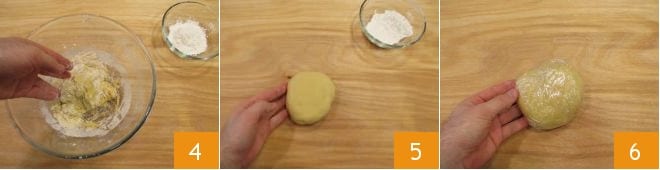 Ensuite, continuez avec les mains 4 et lorsque vous aurez obtenu une pâte plus compacte, transférez-vous sur la planche à pâtisserie, en continuant à bien pétrir jusqu'à obtenir une pâte lisse et homogène : ajoutez de la farine si nécessaire 5. Enveloppez la boule dans du film transparent et laissez reposer, à température ambiante, pendant une demi-heure 6.