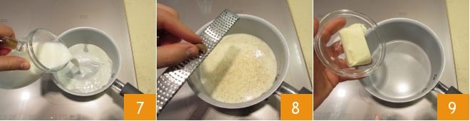 Entre-temps, préparez la Béchamel. Dans une petite casserole, faites chauffer 500 g de lait 7 et aromatisez-le en râpant de la noix de muscade 8. Dans une autre petite casserole, faites fondre le beurre 9