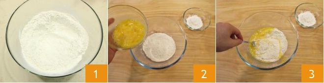 Pour préparer les nids d'hirondelle, commencez par la Pâtes fraîches aux œufs (feuilletage et formats). Dans un récipient, versez la farine 1 puis déplacez-vous sur une planche à pâtisserie, ou sur le plan de travail, et ajoutez les œufs à température ambiante. N'oubliez pas de mettre de côté un peu de farine car les œufs pourraient ne pas réussir à l'absorber complètement 2. Commencez à mélanger avec une fourchette 3.