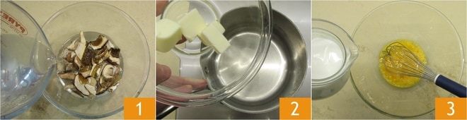Pour réaliser les nids de champignons, crème de potiron et mozzarella, commencez par faire tremper les champignons séchés dans de l'eau froide 1. Pendant ce temps, préparez la pâte pour les crêpes : faites fondre le beurre dans une petite casserole 2 et laissez tiédir. Dans un bol, battez les œufs avec un fouet, puis ajoutez le lait 3 et mélangez à nouveau.