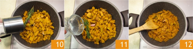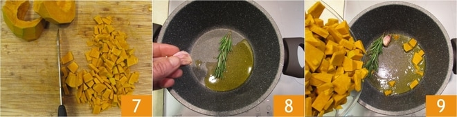Passez à la crème de potiron : nettoyez le potiron et coupez la chair en cubes irréguliers 7. Dans une casserole, faites chauffer l'huile avec le romarin et une gousse d'ail en chemise 8, puis ajoutez les cubes de potiron 9.