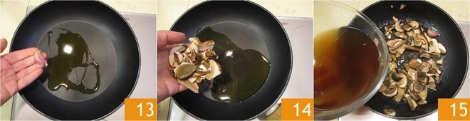 Pendant que le potiron cuit, égouttez les champignons, filtrez l'eau de trempage et réservez-la. Dans une poêle, faites revenir un filet d'huile avec une gousse d'ail en chemise 13, puis ajoutez les champignons 14 et environ 300 g de leur eau 15.
