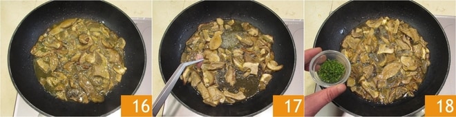 Faites cuire à feu moyen pendant environ 20 minutes 16, puis retirez l'ail 17 et aromatisez avec le persil haché 18. Réservez les champignons.
