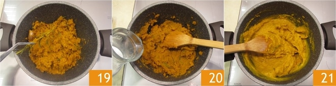 À ce stade, le potiron sera cuit, éteignez donc le feu et retirez l'ail et le romarin 19, puis ajoutez le lait 20 et mélangez bien jusqu'à obtenir une crème 21.