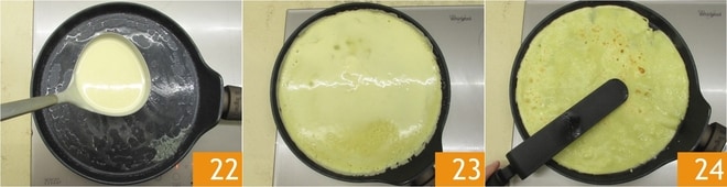 Vous pouvez maintenant cuire les crêpes : mettez sur le feu une poêle à crêpes (ou une poêle anti-adhésive) de 28 cm de diamètre et graissez-la avec un peu de beurre, puis versez au centre une louche de pâte 22 et tournez la poêle pour la répartir uniformément (ou utilisez la spatule appropriée). Après environ une minute à feu moyen-doux, les bords commenceront à se détacher 23, tournez donc la crêpe et cuisez-la une minute de l'autre côté, elle doit être légèrement dorée 24. Continuez ainsi jusqu'à épuisement de la pâte, en empilant les crêpes au fur et à mesure sur une assiette.