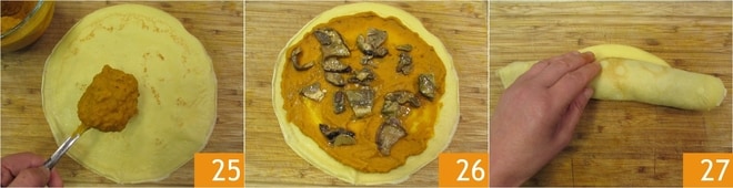 Vous êtes prêts à assembler le plat : étalez chaque crêpe avec la crème de potiron 25, ajoutez quelques champignons 26 et roulez-la 27.