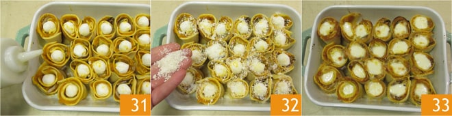 Égalisez les bords du rouleau et divisez-le en morceaux d'environ 4 cm de large 28; avec ces quantités, vous obtiendrez environ 20 pièces. Disposez les roulés obtenus dans un plat à gratin préalablement graissé avec de l'huile, en les plaçant debout les uns à côté des autres 29. Enfin, ajoutez une petite mozzarella sur chaque nid 30.
