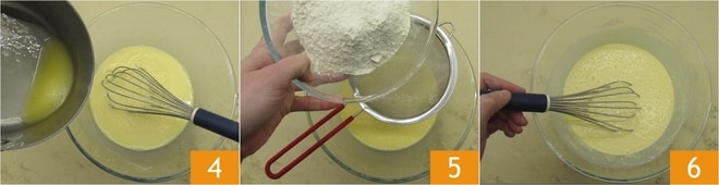 Ajoutez le beurre fondu au mélange 4 et une pincée de sel. Amalgamez le tout et incorporez également la farine tamisée 5. Mélangez jusqu'à obtenir une pâte lisse et homogène 6. Couvrez le bol avec du film alimentaire et laissez reposer au réfrigérateur pendant au moins 30 minutes.
