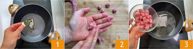 Pour préparer les nids de tagliatelles, versez un filet d'huile, l'ail et les branches de thym dans une casserole et laissez chauffer à feu doux 1. Émiettez la saucisse directement à la main pour obtenir plus facilement des boulettes d'environ 1 cm 2. Retirez les aromates du fond et versez les boulettes 3.